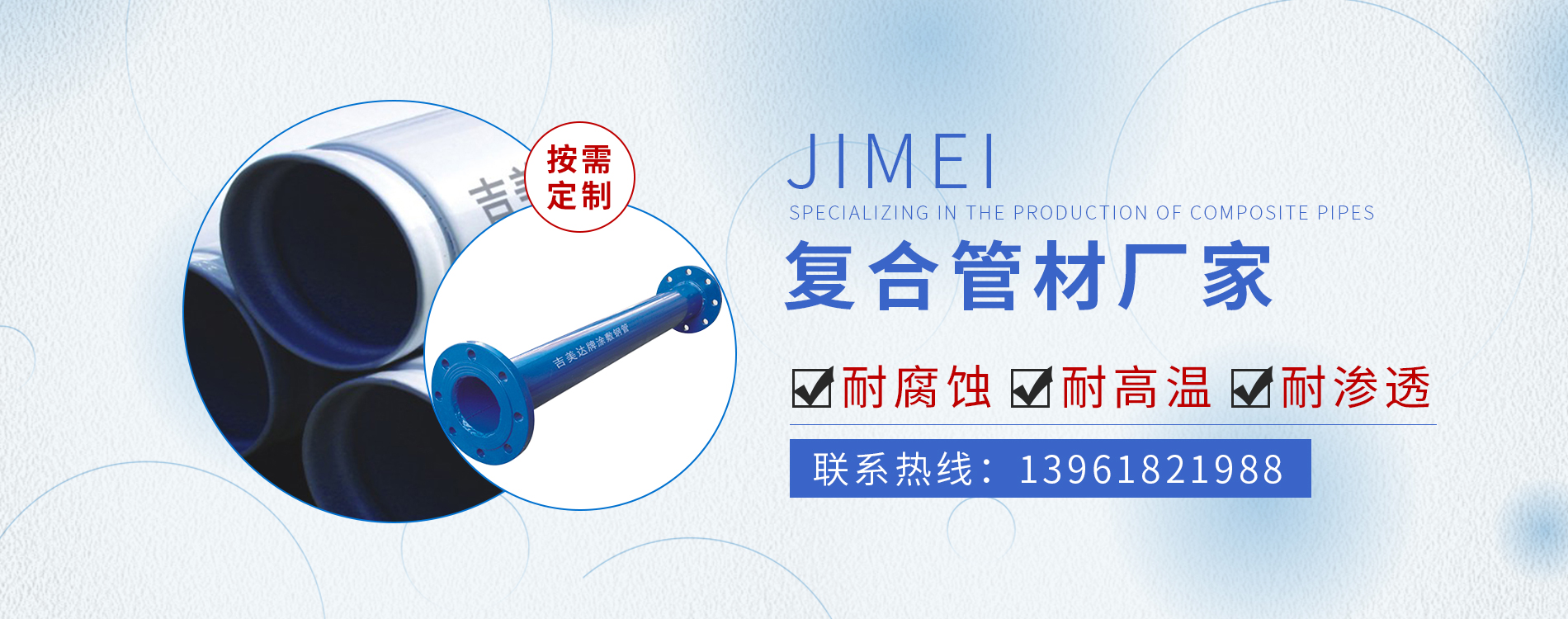 常州市吉美管業(yè)有限公司,是一家專業(yè)生產(chǎn)復(fù)合管材的生產(chǎn)企業(yè)。 依靠公司技術(shù)力量和多年的實(shí)踐經(jīng)驗(yàn),可年生產(chǎn)內(nèi)襯塑、內(nèi)襯外涂、內(nèi)外涂PE、PEX、EP復(fù)合管道以及工業(yè)防腐管道等多種復(fù)合管材及管件10萬(wàn)噸的生產(chǎn)能力。
